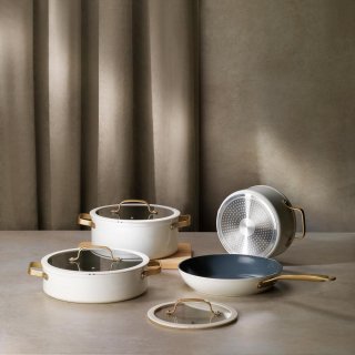 Geri dönüşümlü, tamamen doğal malzemeden, çevre dostu teknoloji ile üretilen Çömlek çizilmeye karşı ekstra dirençli volkanit görünümlü PTFE kaplama ve yüksek ısıya dayanıklı silikon dış kaplama ile çok az yağ kullanarak lezzetli yemekler yapar.