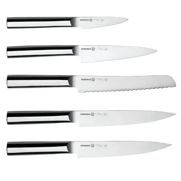 Profesyonel mutfaklardan ilham alan Korkmaz Pro-Chef Bıçak Seti, keskinliği, dayanıklılığı ve zarif tasarımıyla mutfakta kusursuz bir deneyim sunar. Günlük kullanımdan profesyonel kesimlere kadar her ihtiyacınıza uygun olarak tasarlanmıştır.