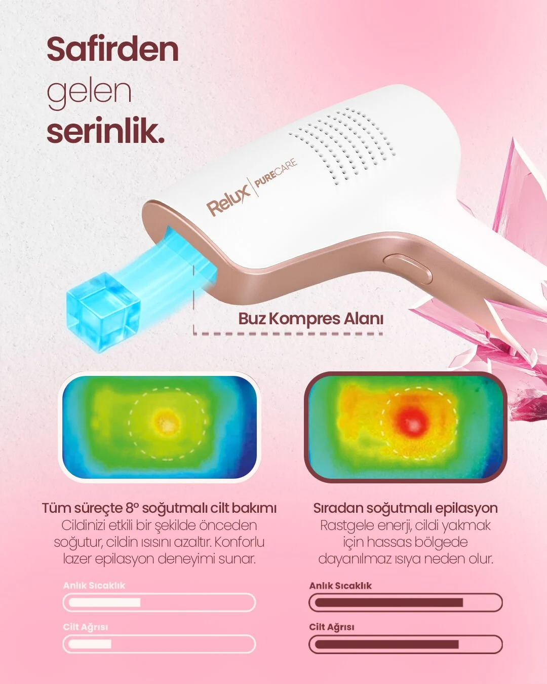 Relux IPL9650, geliştirilmiş SapphireCool Safir Soğutma Teknolojisi ile cildinizi işlem sırasında ferahlatır, cilt ısısını düşürerek daha konforlu bir kullanım sunar. Safir taşının soğutucu etkisi, uygulama bölgesini etkili bir şekilde 8°C’ye kadar soğutarak kızarıklık ve yanma hissini en aza indirir.