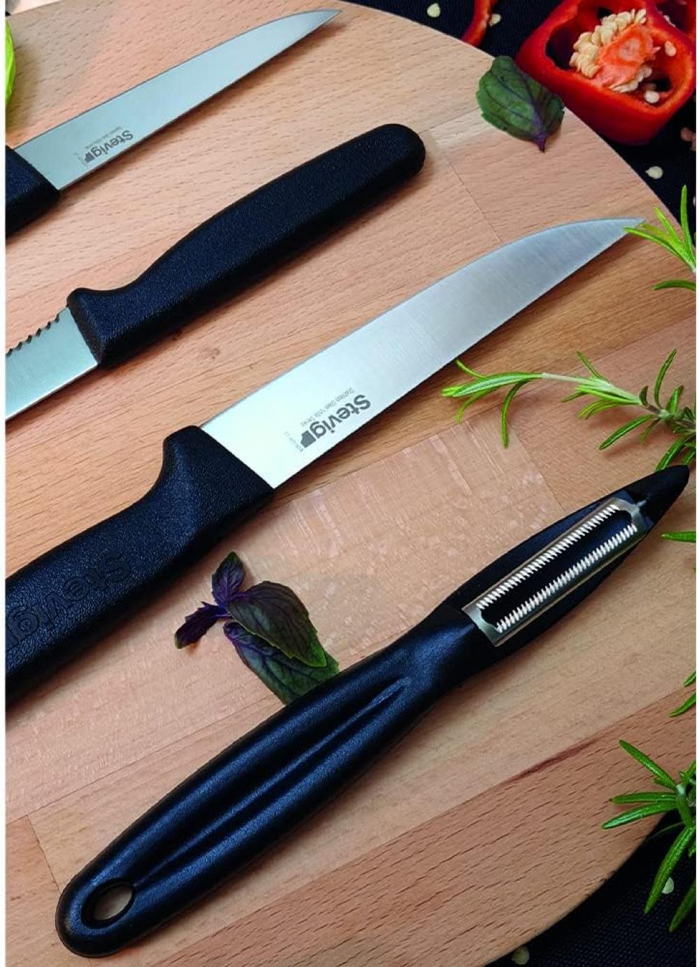 Kahvaltı hazırlarken, salata doğrayıp akşam yemeğine yetişirken, Stevig Fresh senin yanındadır. Farklı boy ve kenar tasarımlarına sahip bıçakları, her ihtiyaca uygun kesim deneyimi sunar. Çift taraflı döner soyacağı ise sebze ve meyve kabuklarını hızlıca, israf etmeden soymanı sağlar.