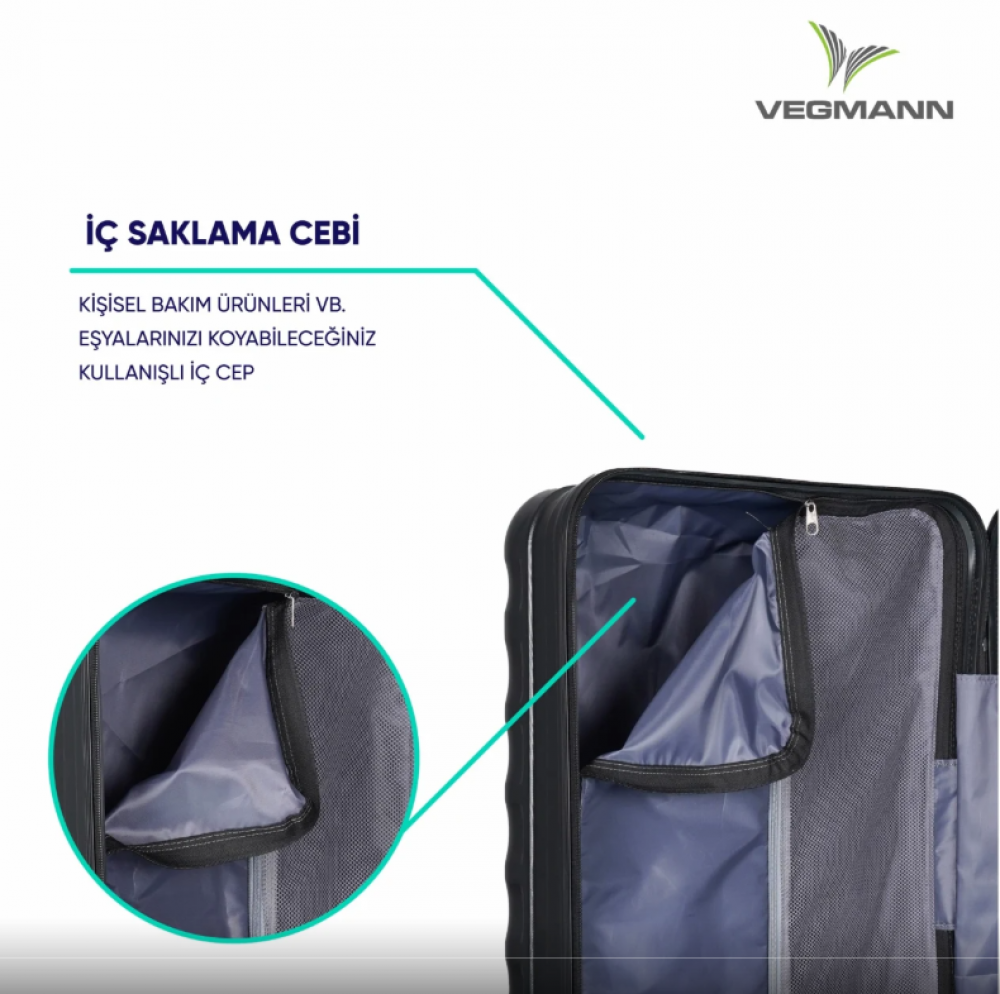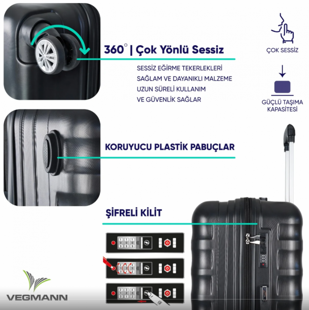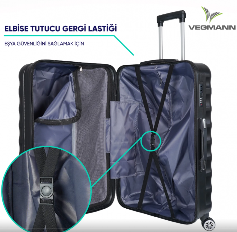 Üst düzey kalite ABS malzemeden üretilen Vegmann Delphin Büyük Boy Valiz; hafif, şık ve dayanıklı yapısıyla uzun ve yoğun seyahatler için ideal bir kullanım sunar. Kırılma ve ezilmeye karşı dayanıklı gövdesi sayesinde eşyalarınızı güvenle korur.