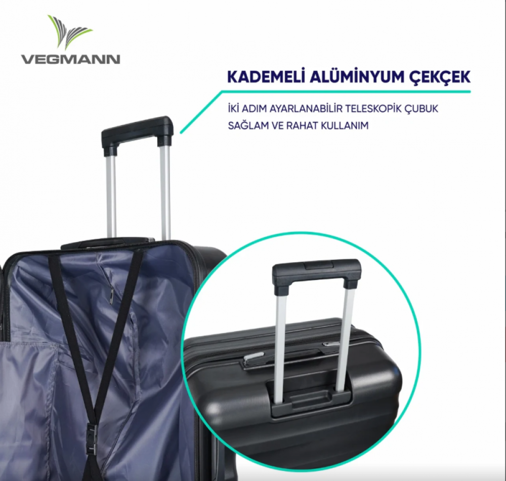 Mat ve pütürlü yüzeyi çizilmelere karşı dayanıklıdır. Büyük boy valizlerde tek kademeli, orta ve kabin boylarda ise çift kademeli olarak tasarlanan alüminyum çekçek sistemi, dengeli ve konforlu bir taşıma deneyimi sunar. Elinizi acıtmayan yumuşak ergonomik tutma sapı sayesinde kullanım rahatlığı sağlar.