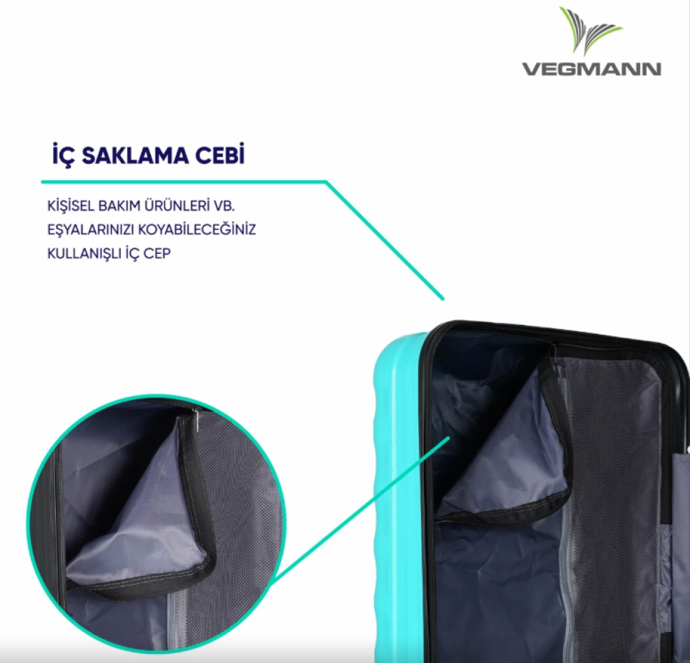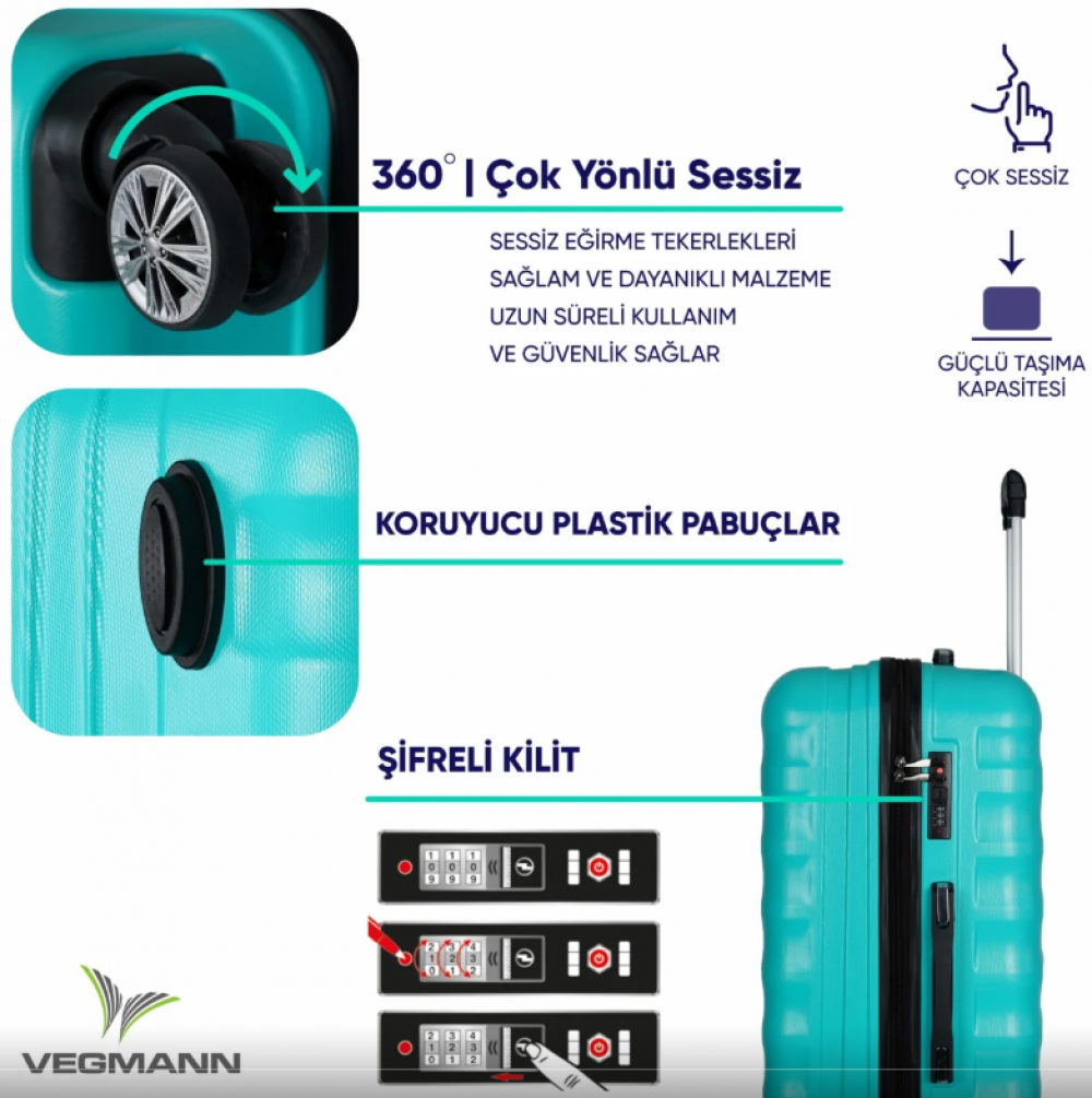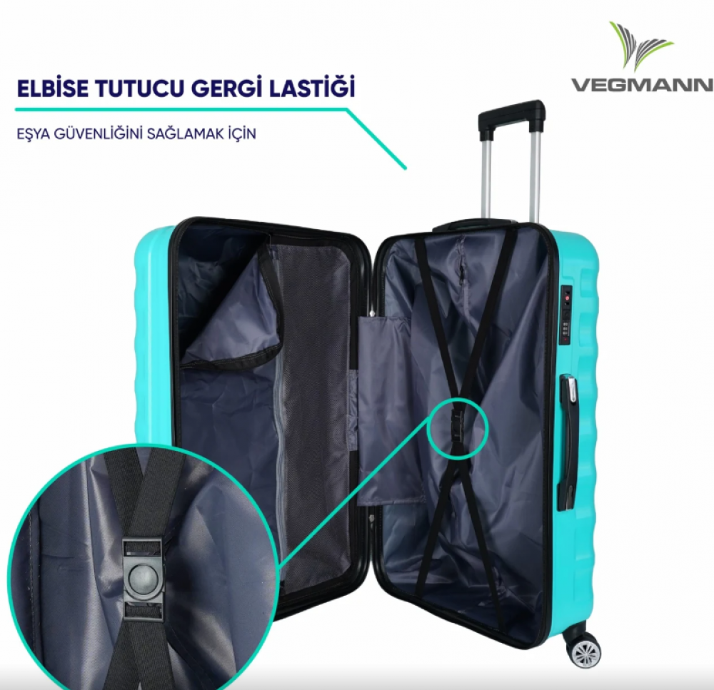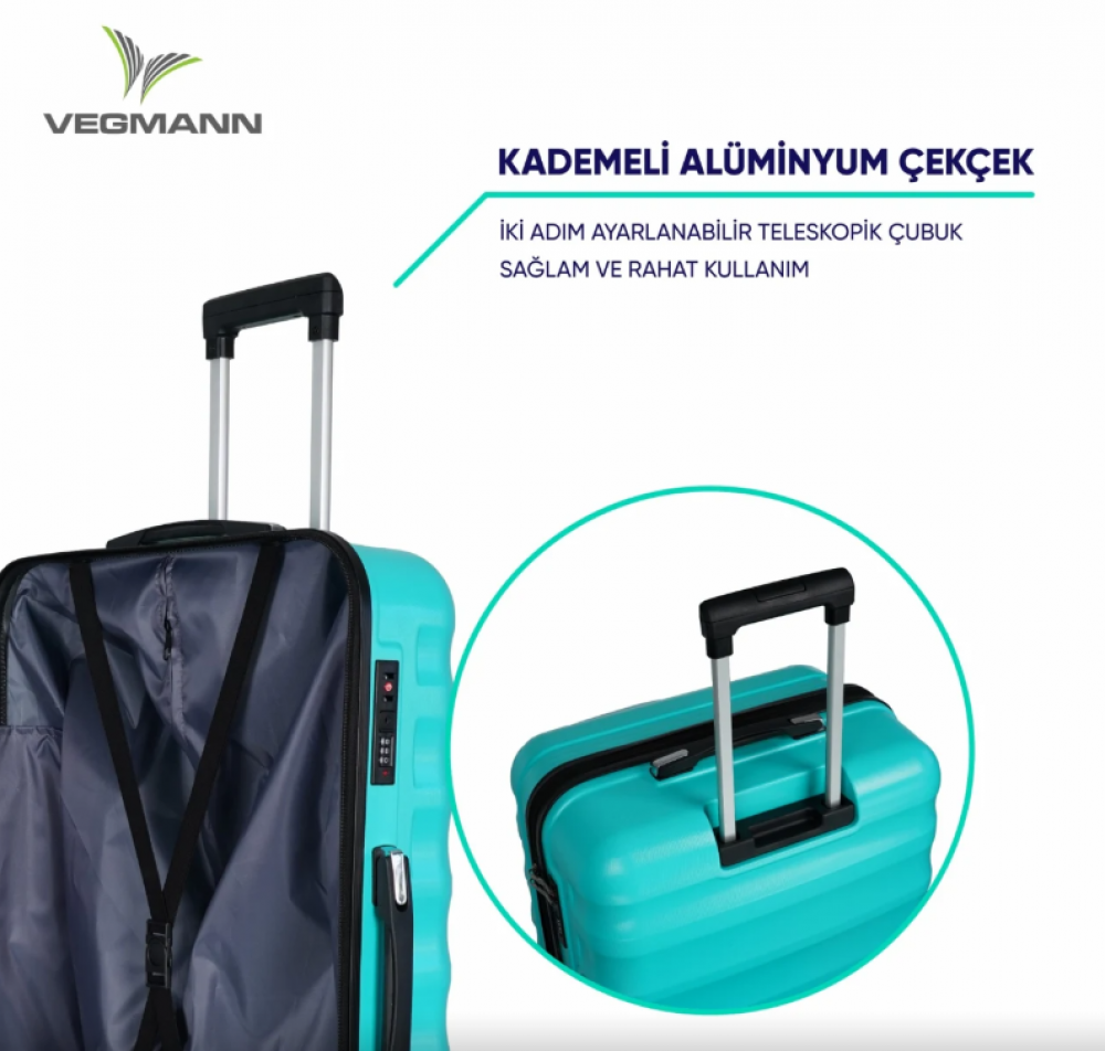 Üst düzey kalite ABS malzemeden üretilen Vegmann Delphin Büyük Boy Valiz; hafif, şık ve dayanıklı yapısıyla uzun ve yoğun seyahatler için ideal bir kullanım sunar. Kırılma ve ezilmeye karşı dayanıklı gövdesi sayesinde eşyalarınızı güvenle korur.