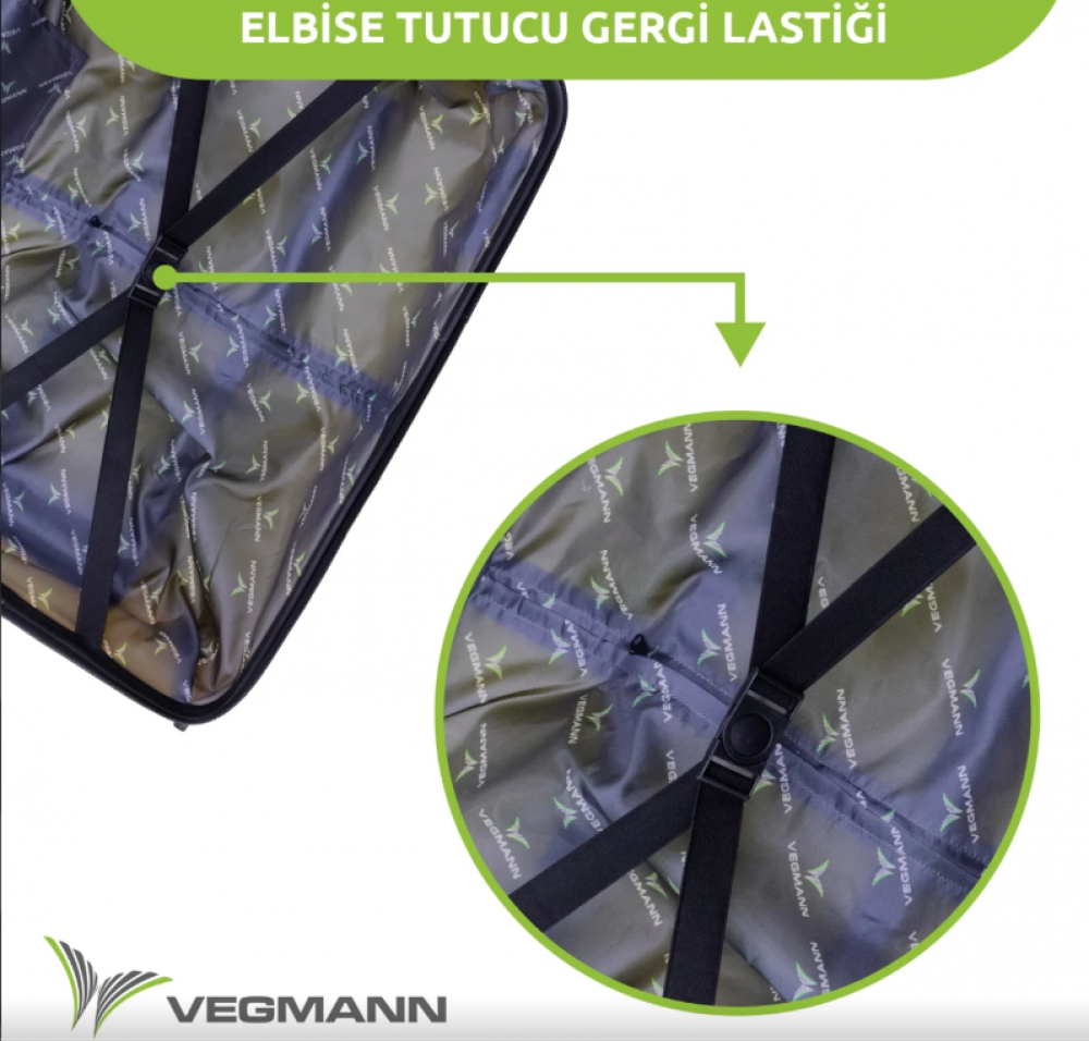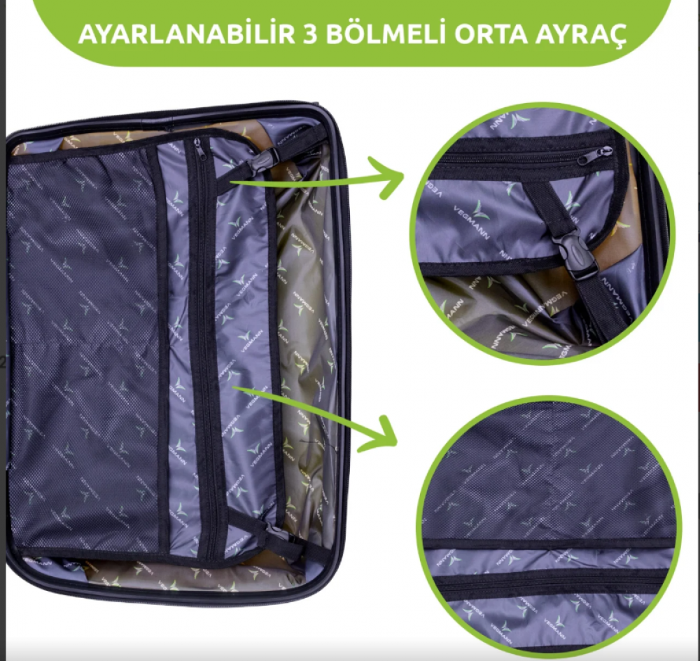 İç lastikli kilitli kemer ve fermuarlı bölme sayesinde eşyalar sabit ve düzenli kalır