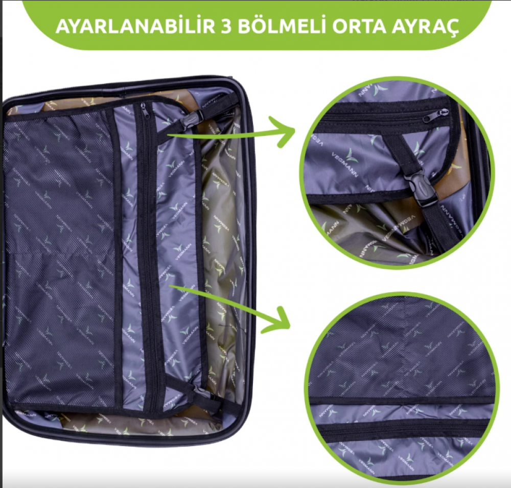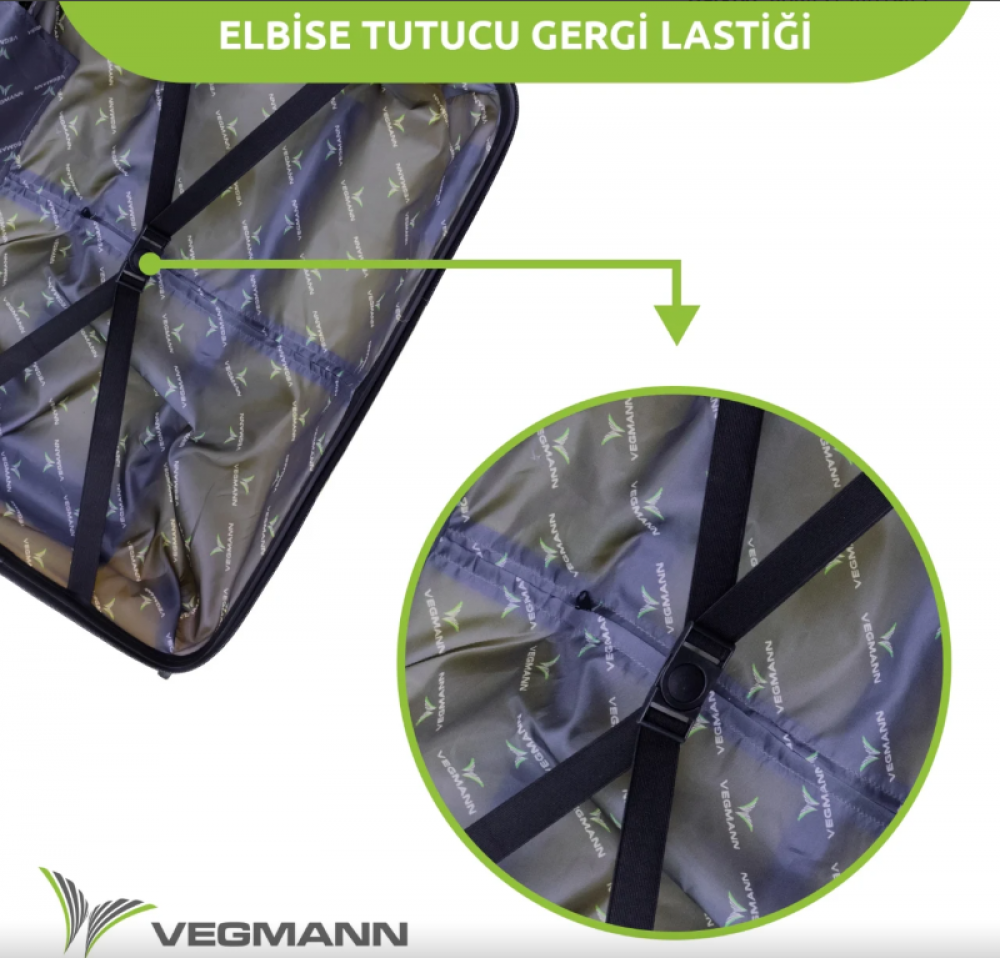 İç lastikli kilitli kemer ve fermuarlı bölme sayesinde eşyalar valiz içinde sabit ve düzenli kalır